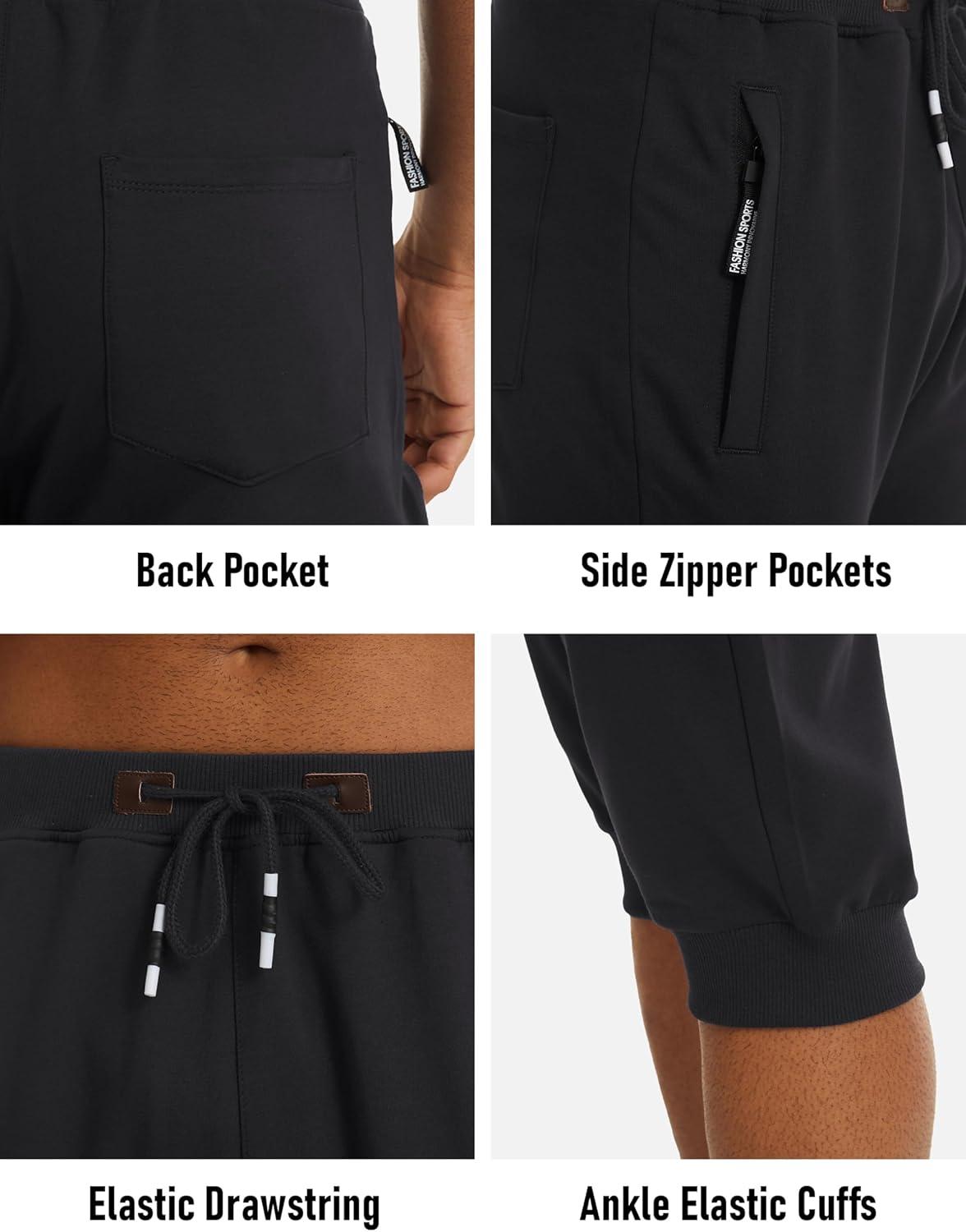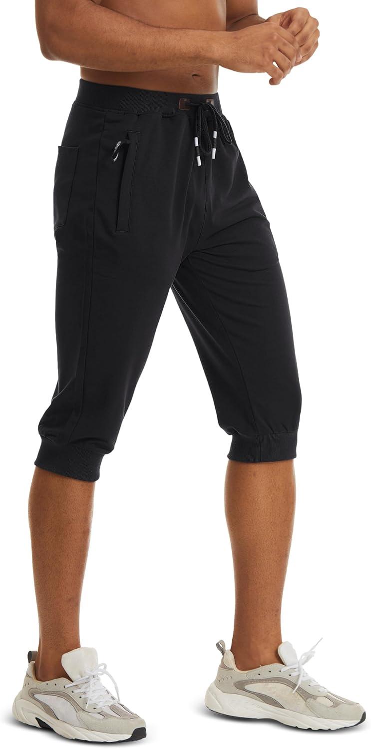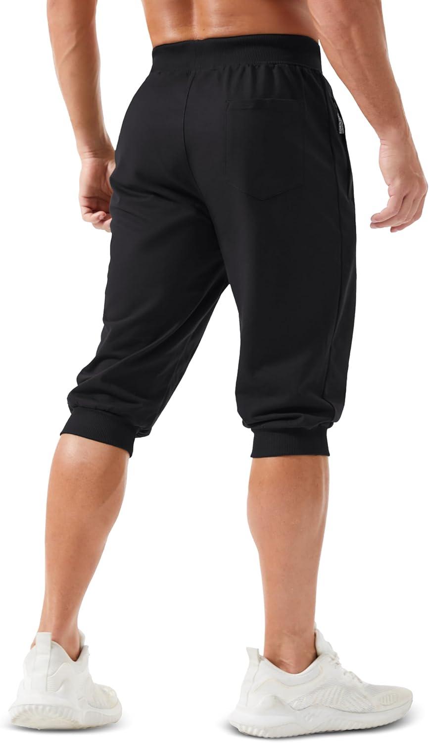MAGCOMSEN Men’s 3/4 Jogger Capri Pants with Zipper Pockets Knee Length Running Training Workout Shorts(Black)