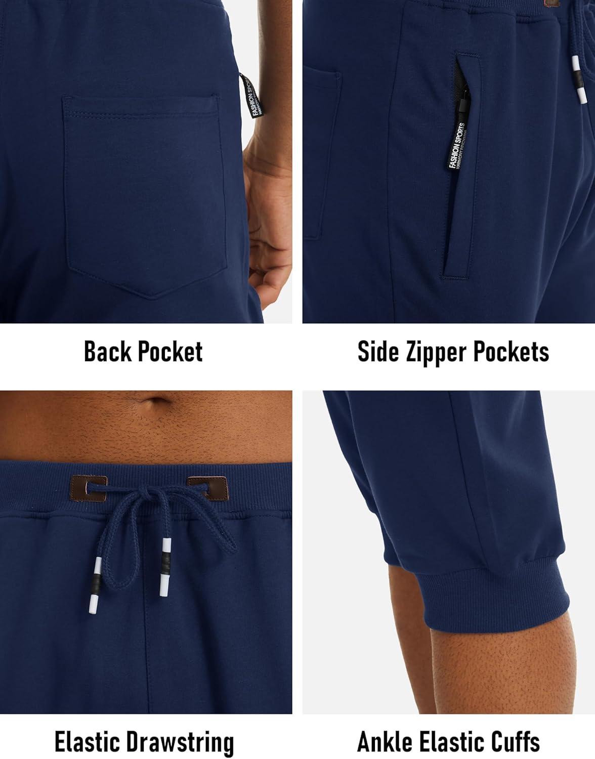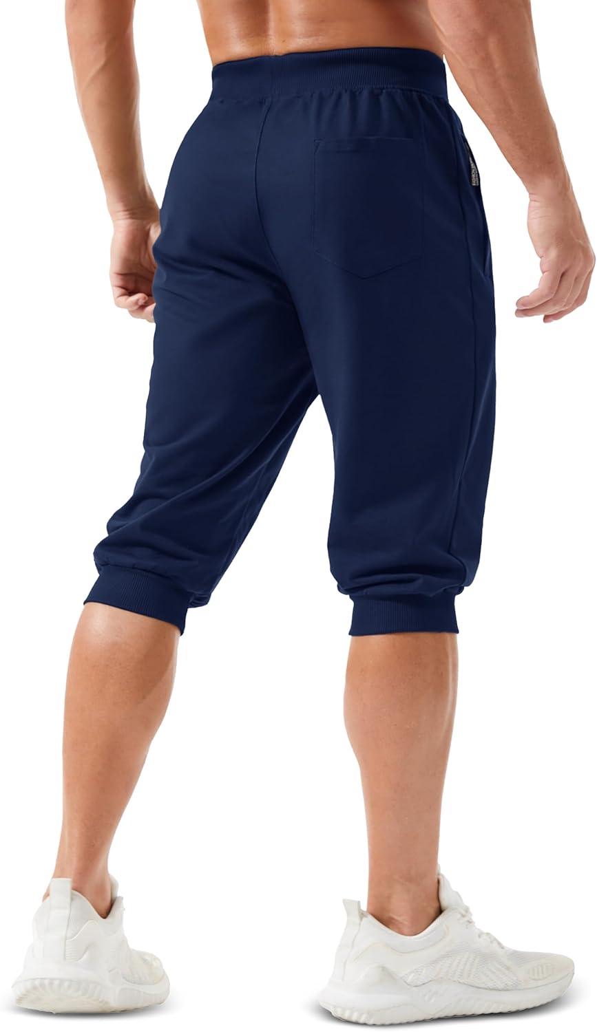 MAGCOMSEN Men’s 3/4 Jogger Capri Pants with Zipper Pockets Knee Length Running Training Workout Shorts(Navy)