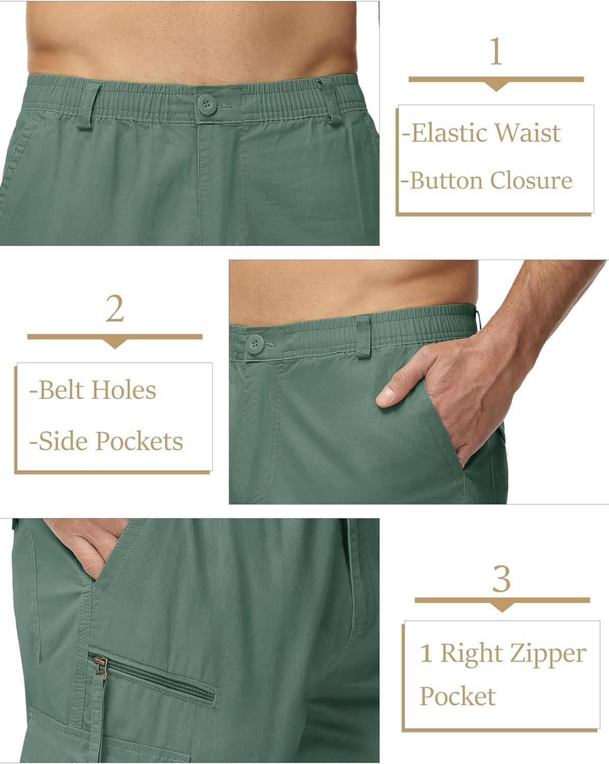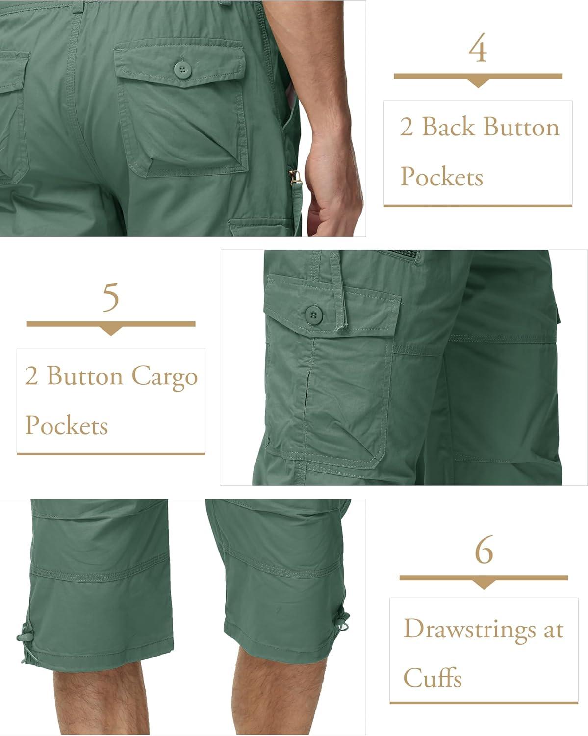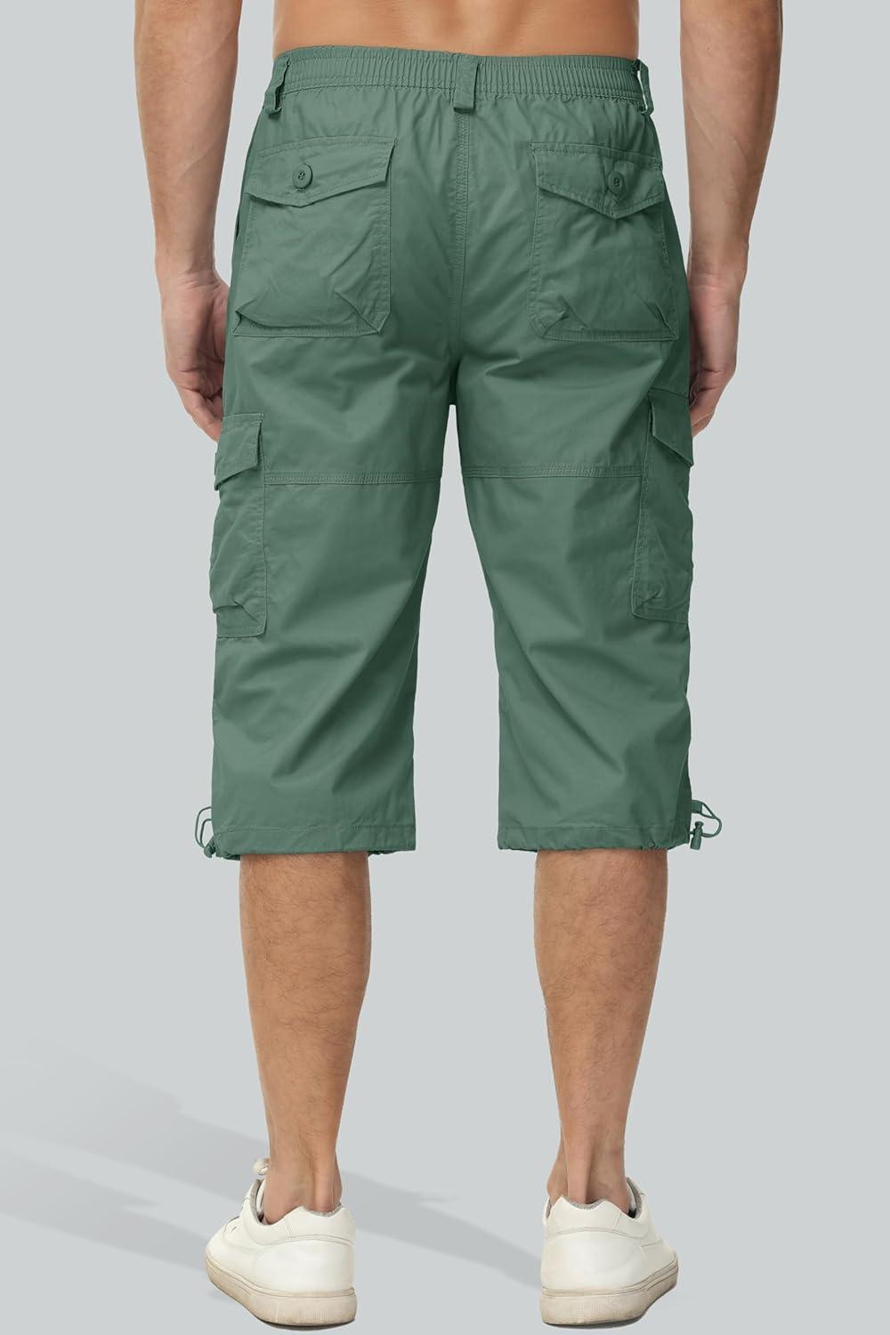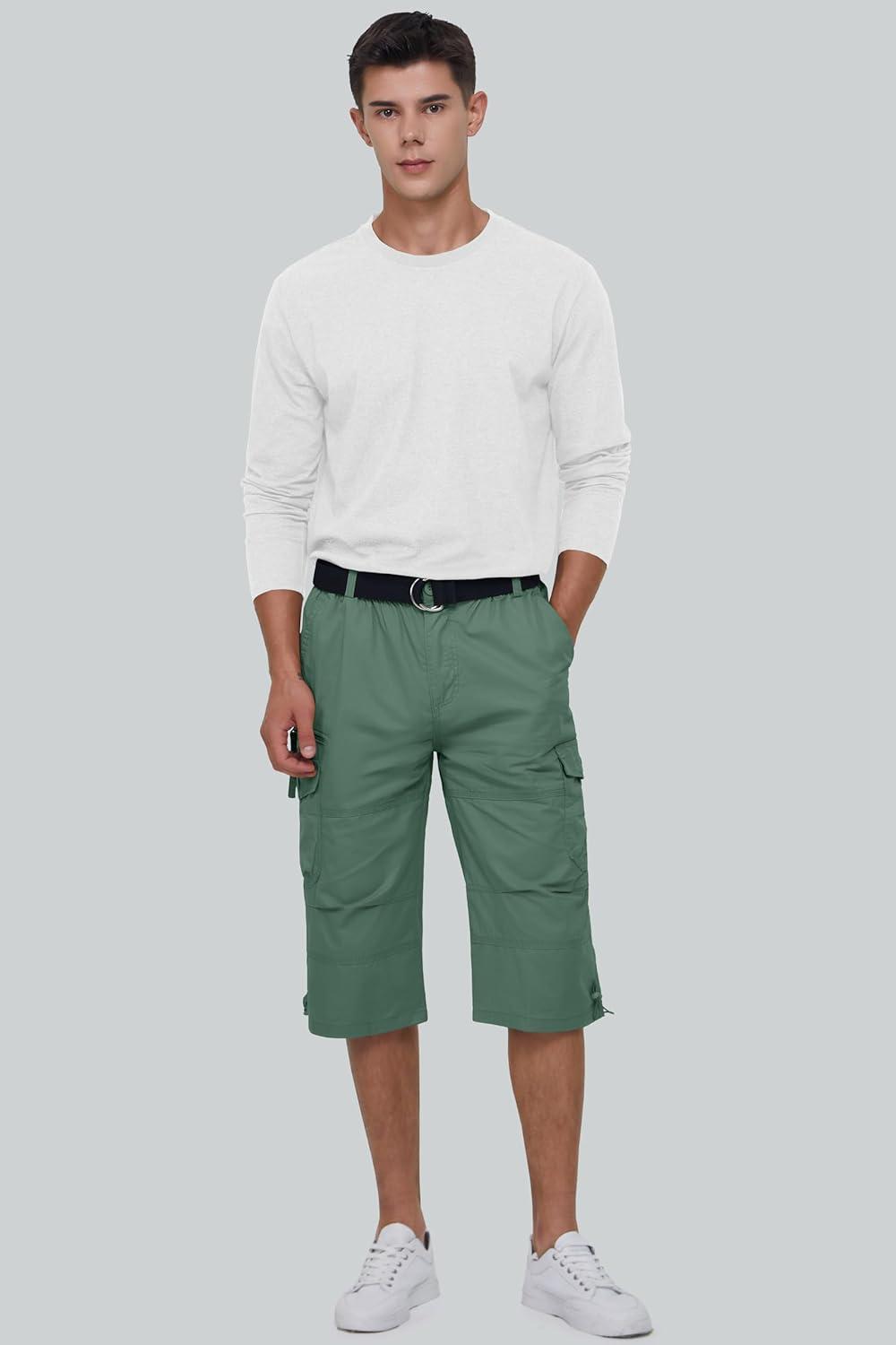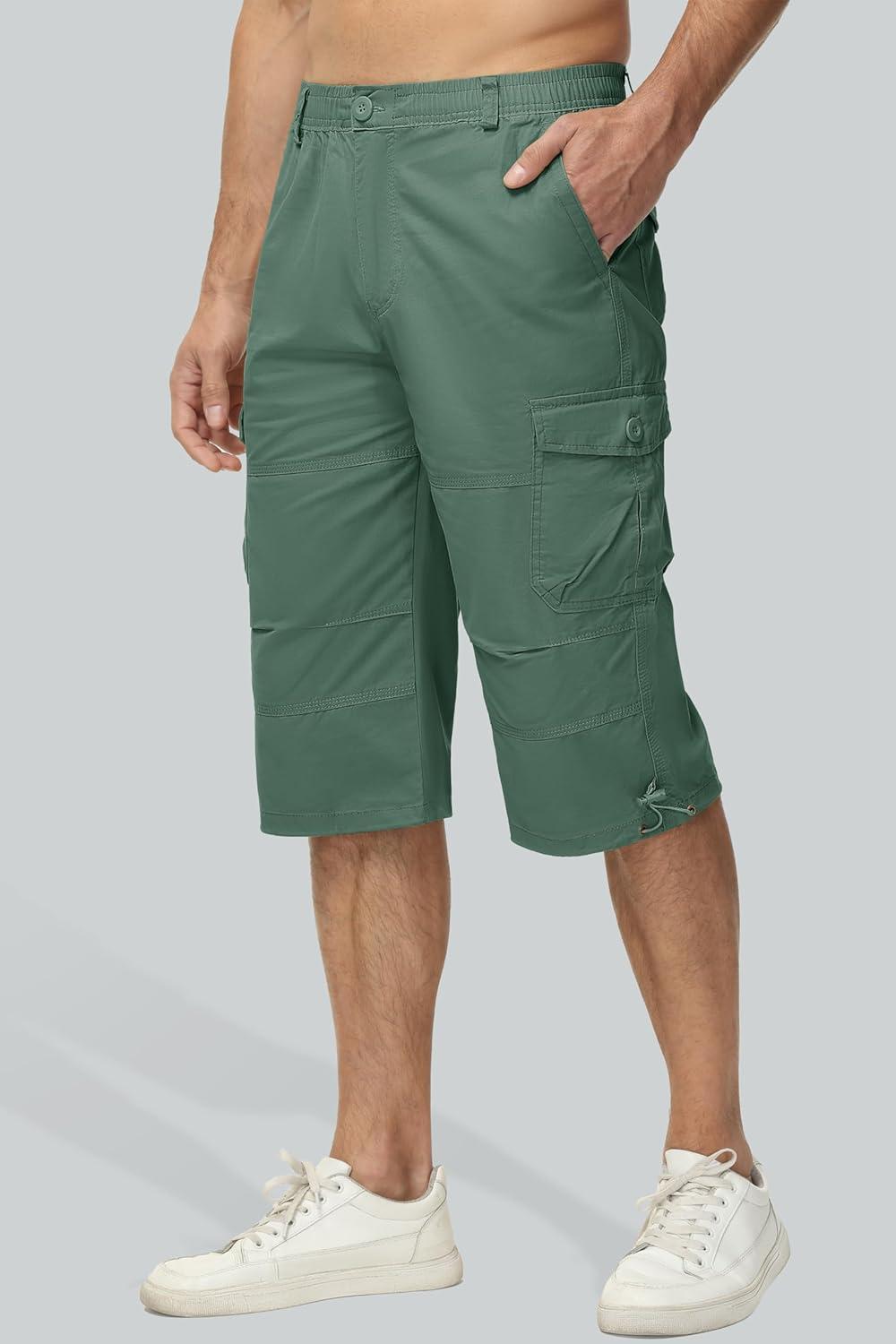 MAGCOMSEN Mens Cargo Shorts Long Capri Elastic Below The Knee 3/4 Cotton Casual Summer Shorts with Pockets(Pea Green)