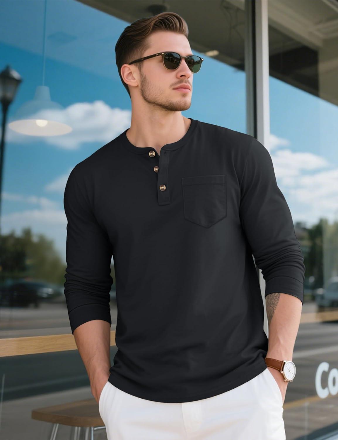 MAGCOMSEN Men’s Henley Long Sleeve Shirt Cotton Lightweight Tee Shirts Casual Basic Tees with Pocket(Black)