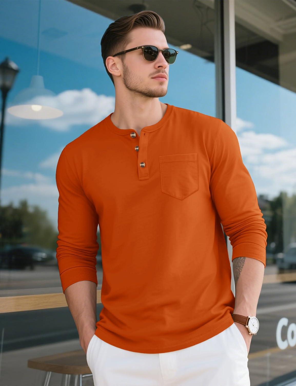MAGCOMSEN Men’s Henley Long Sleeve Shirt Cotton Lightweight Tee Shirts Casual Basic Tees with Pocket(Dark Orange)