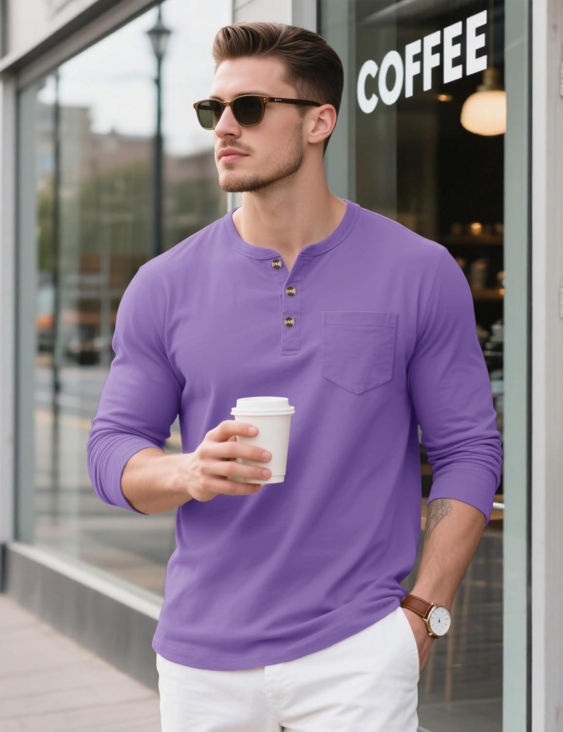 MAGCOMSEN Men’s Henley Long Sleeve Shirt Cotton Lightweight Tee Shirts Casual Basic Tees with Pocket(Light Purple)