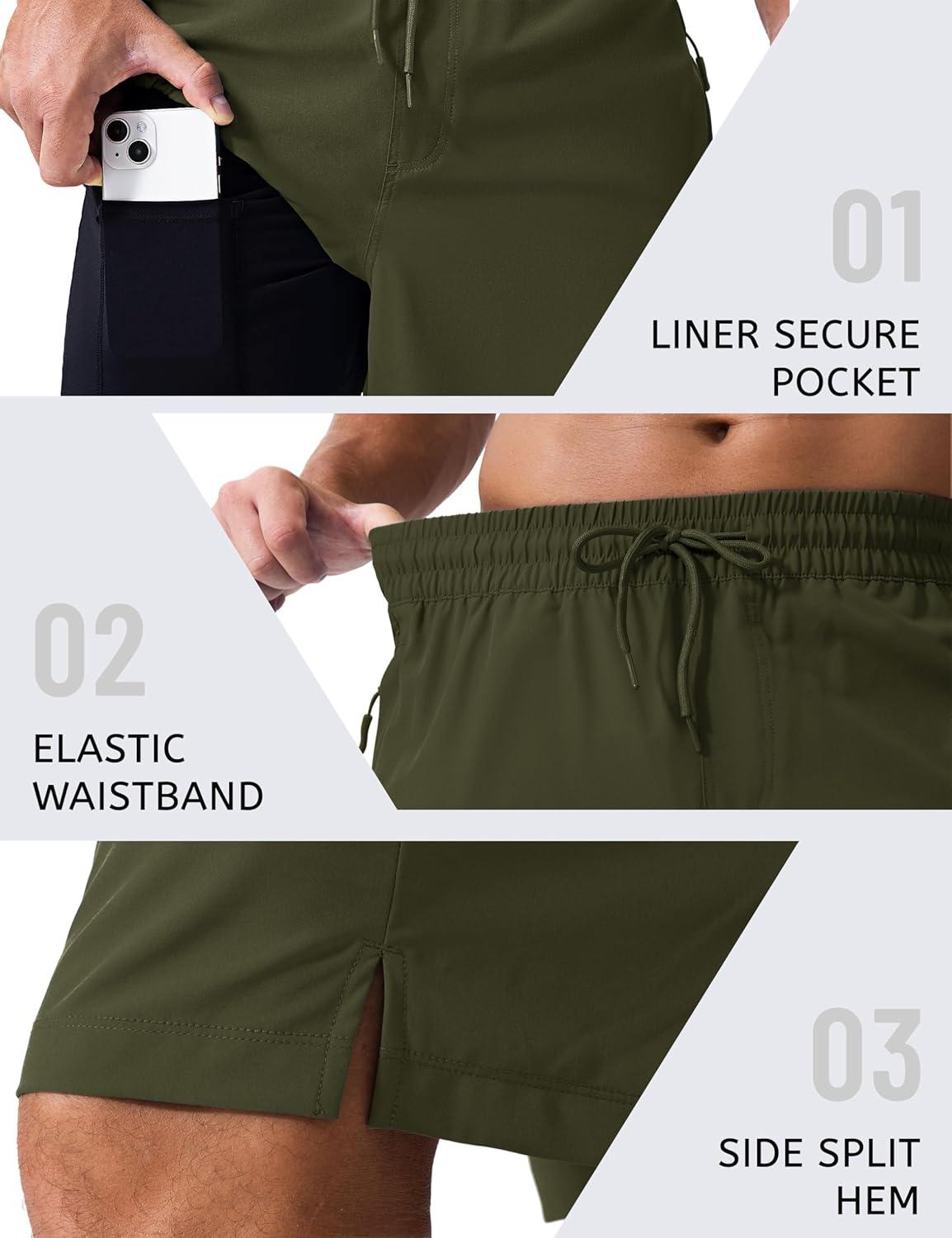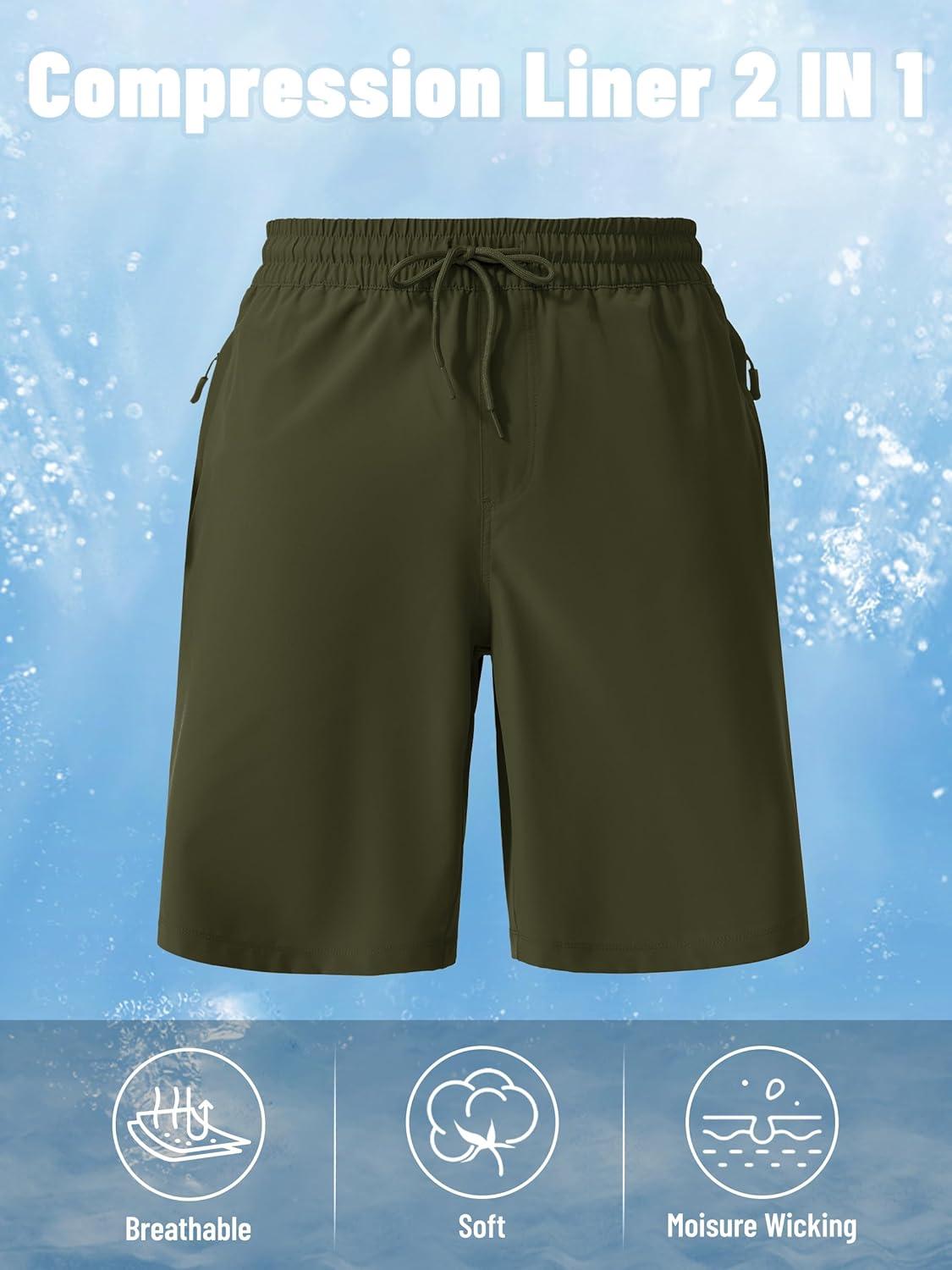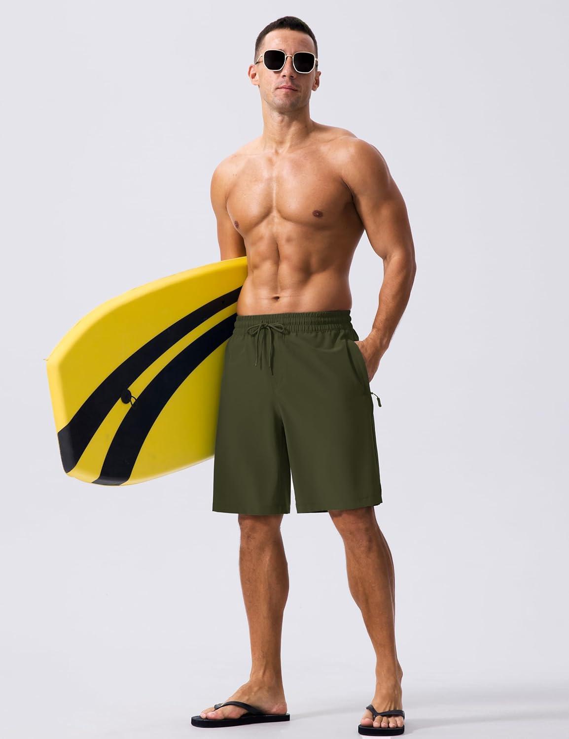 MAGCOMSEN Men’s Swim Trunks with Compression Liner 9″ Quick Dry Beach Shorts with Zipper Pockets(Army Green)