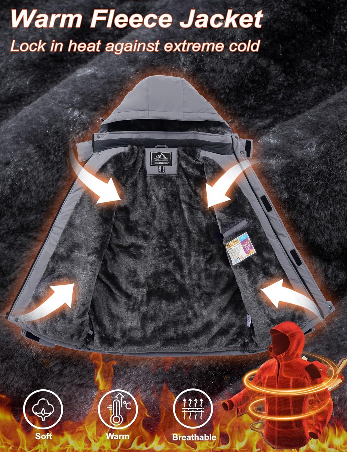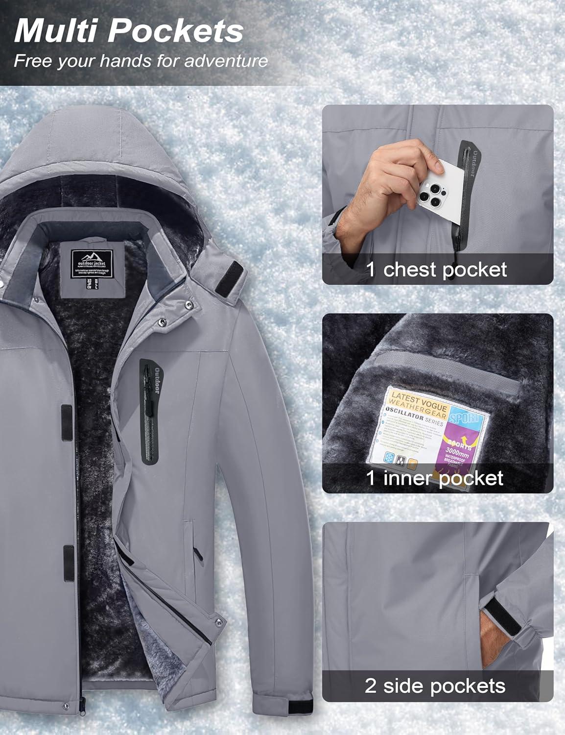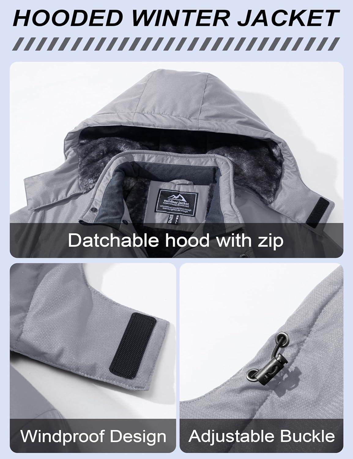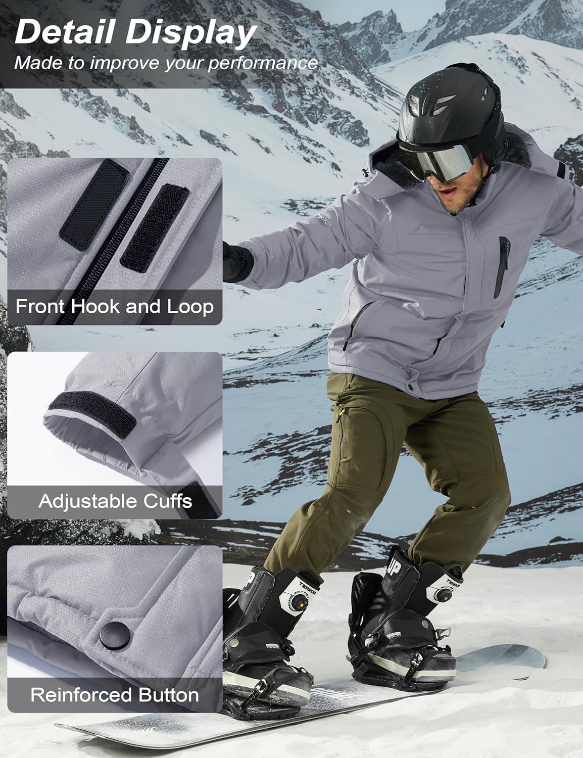 MAGCOMSEN Men’s Winter Coats Ski Snow Water Resistant Jacket Warm Fleece Parka Raincoats with Hood for Hiking Work(Light Grey)