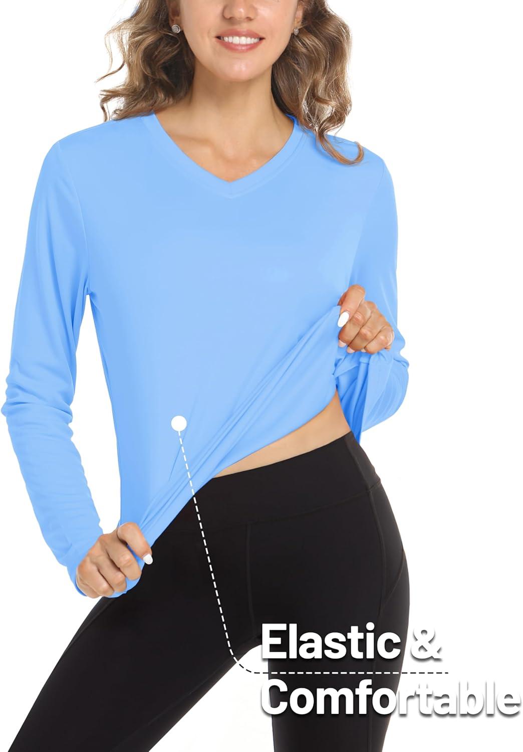 MAGCOMSEN SPF Shirts for Women Long Sleeve Workout Tops V-Neck UPF 50+ UV Sun Shirt Quick Dry Performance Tees Swim Tops(Blue)