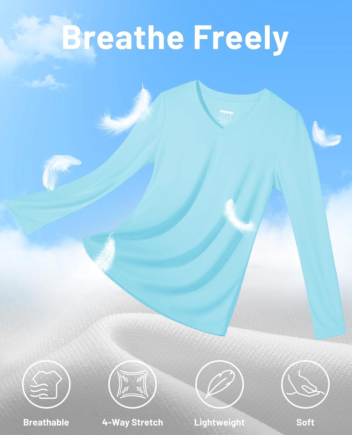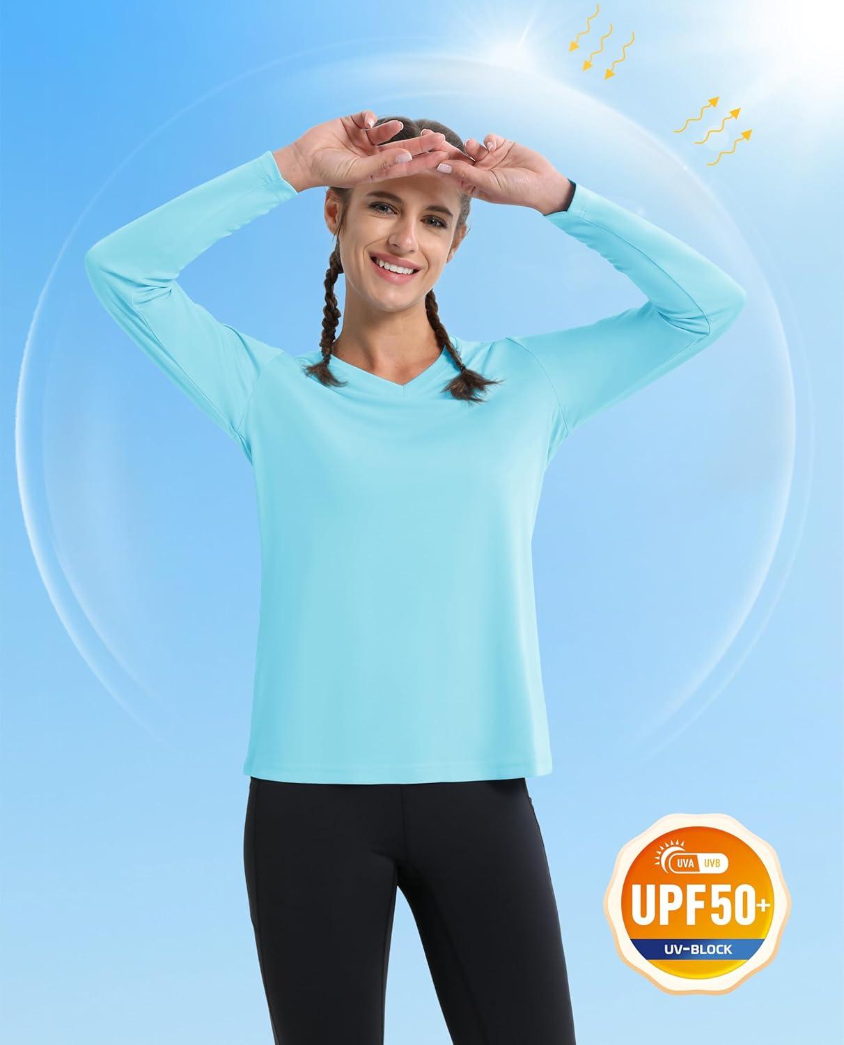 MAGCOMSEN SPF Shirts for Women Long Sleeve Workout Tops V-Neck UPF 50+ UV Sun Shirt Quick Dry Performance Tees Swim Tops(Ice Blue)