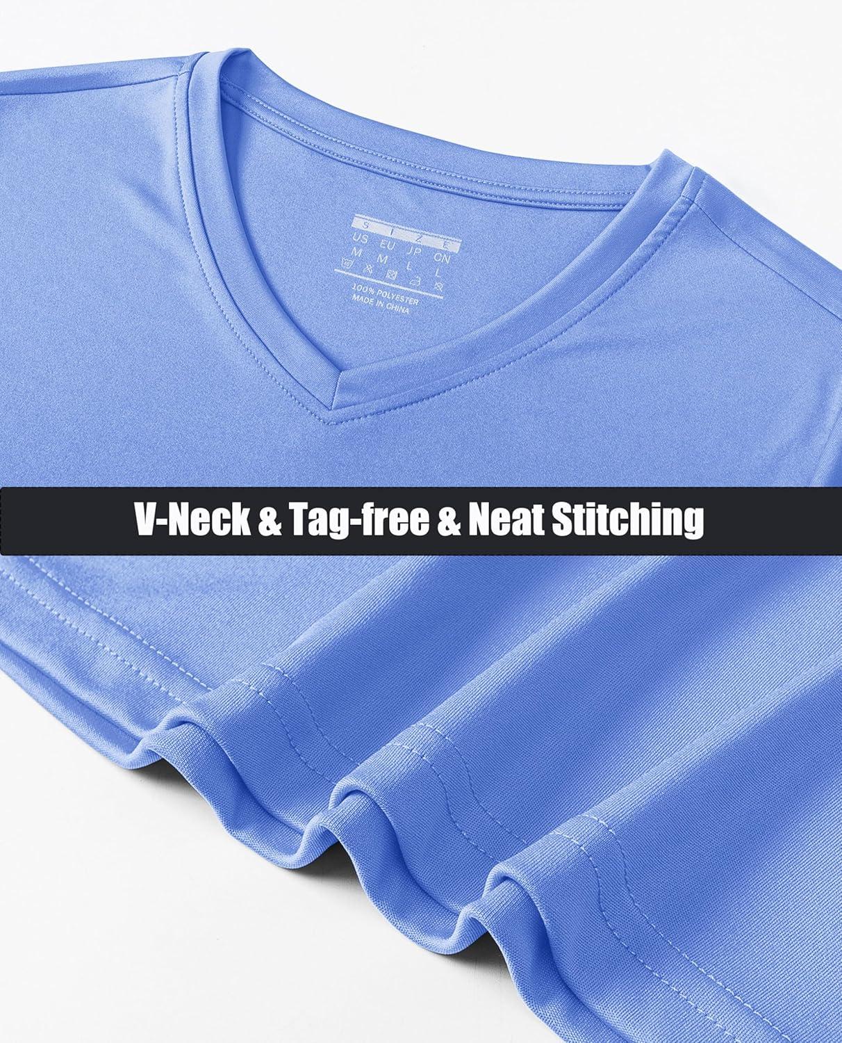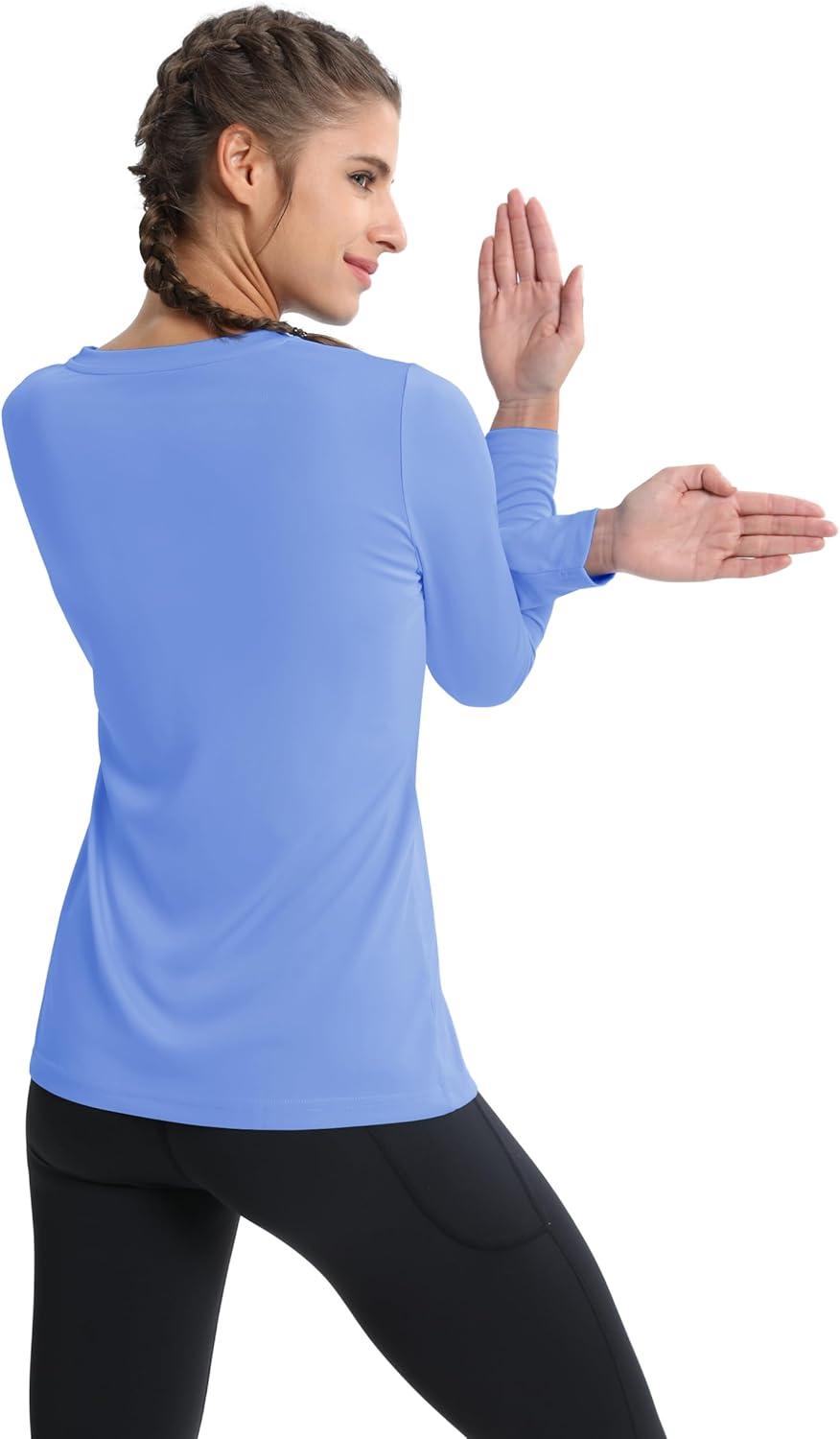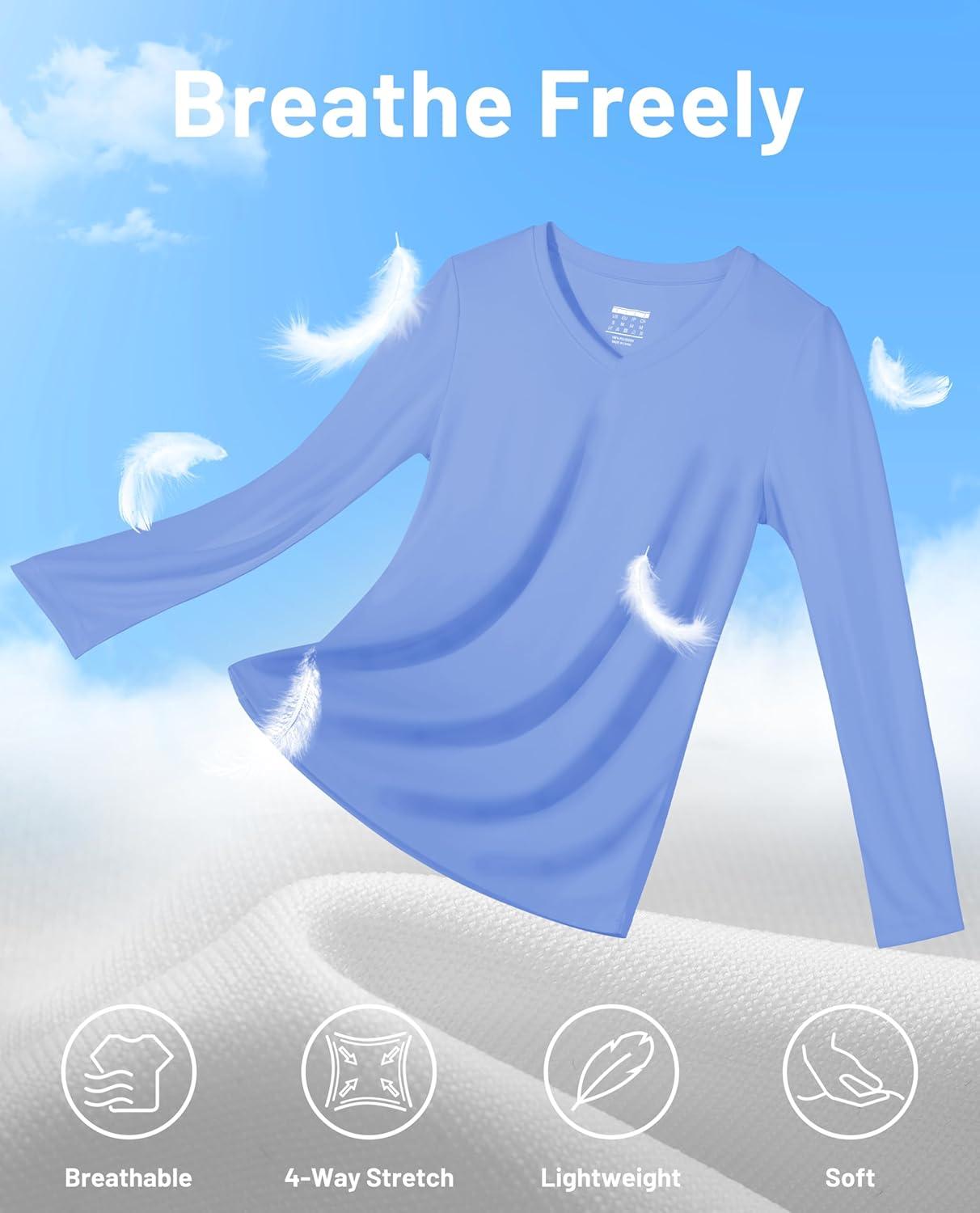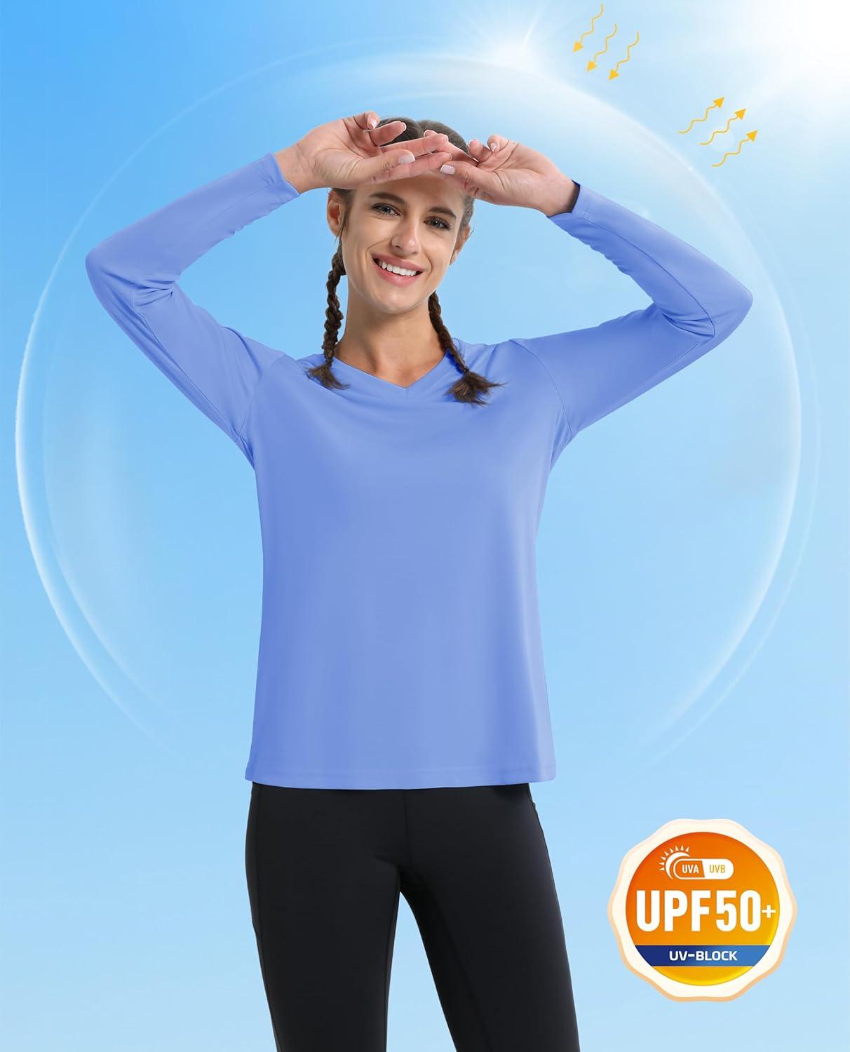 MAGCOMSEN SPF Shirts for Women Long Sleeve Workout Tops V-Neck UPF 50+ UV Sun Shirt Quick Dry Performance Tees Swim Tops(Light Blue)