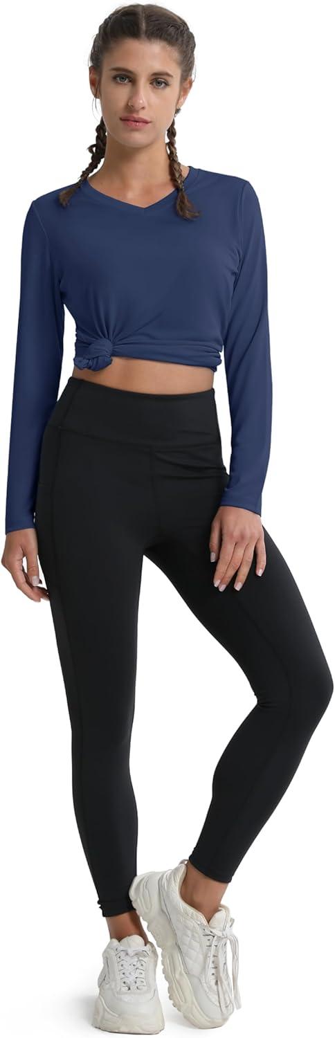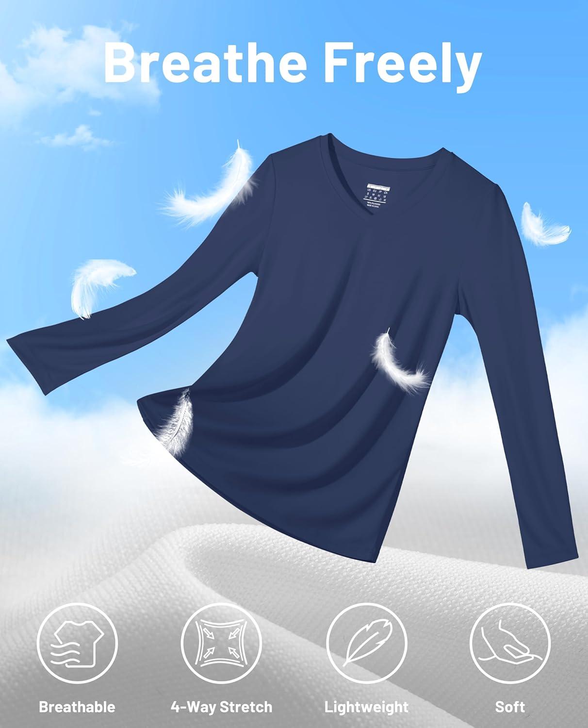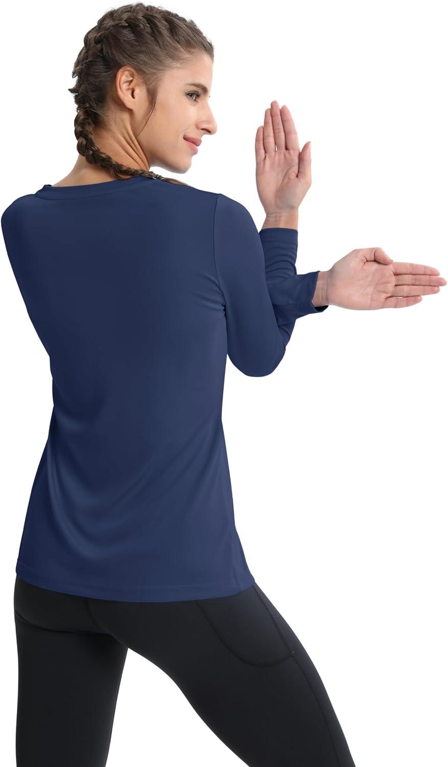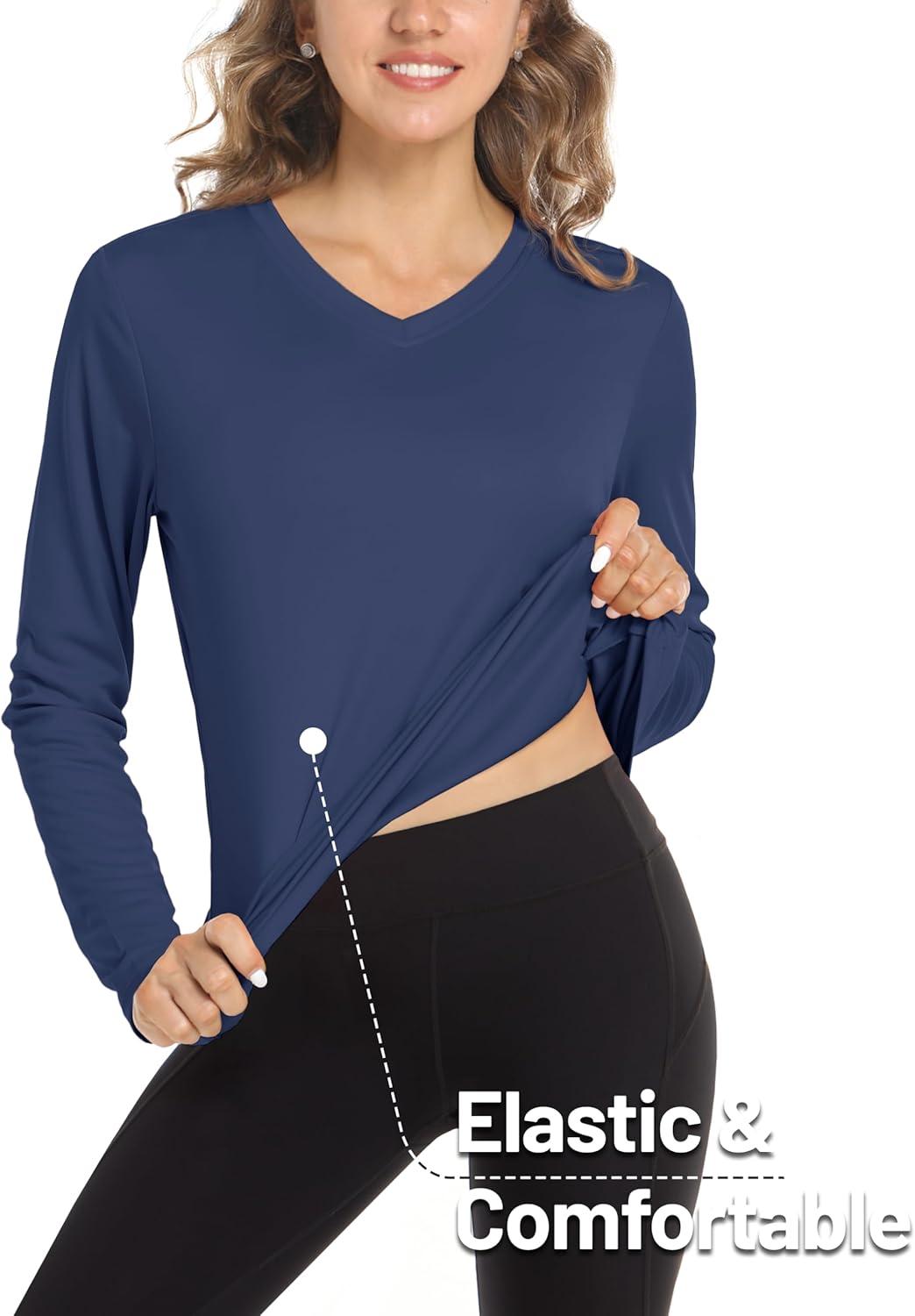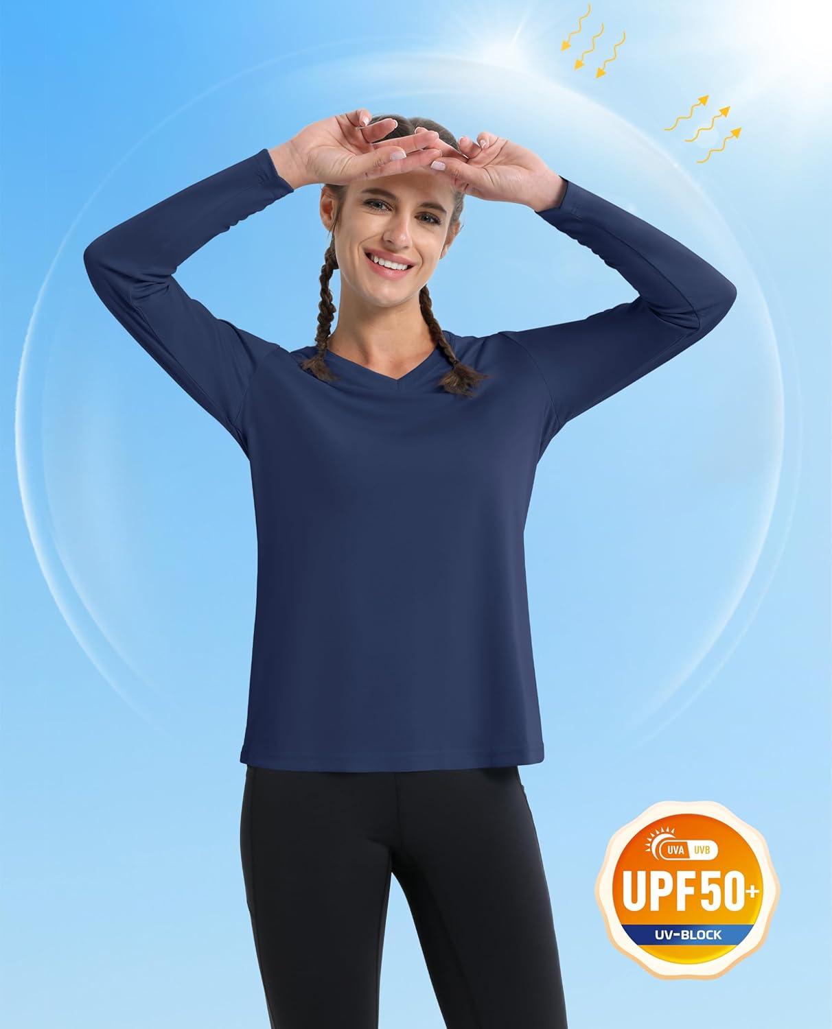 MAGCOMSEN SPF Shirts for Women Long Sleeve Workout Tops V-Neck UPF 50+ UV Sun Shirt Quick Dry Performance Tees Swim Tops(Navy)