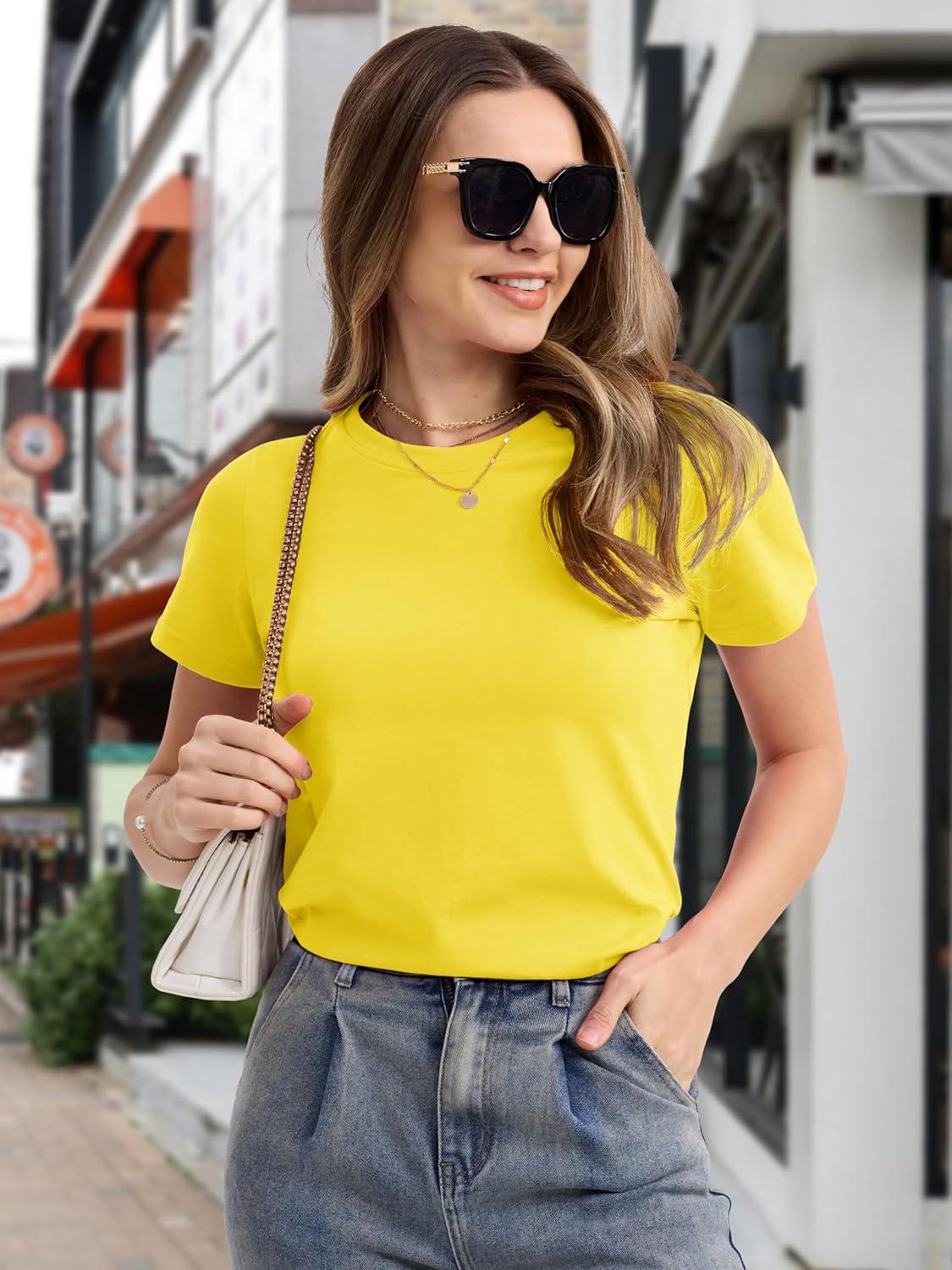 MAGCOMSEN Women’s Cotton T-Shirts Short-Sleeve Shirts Crew-Neck Tops Classic-Fit Breathable Casual Summer Tees(A-yellow)