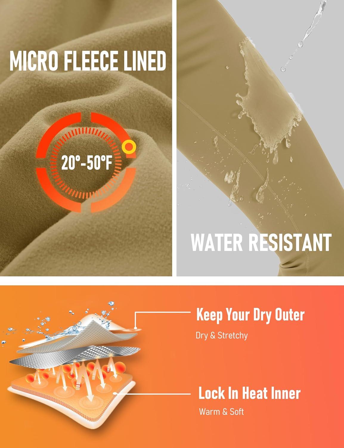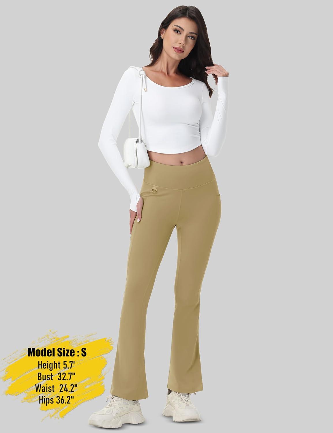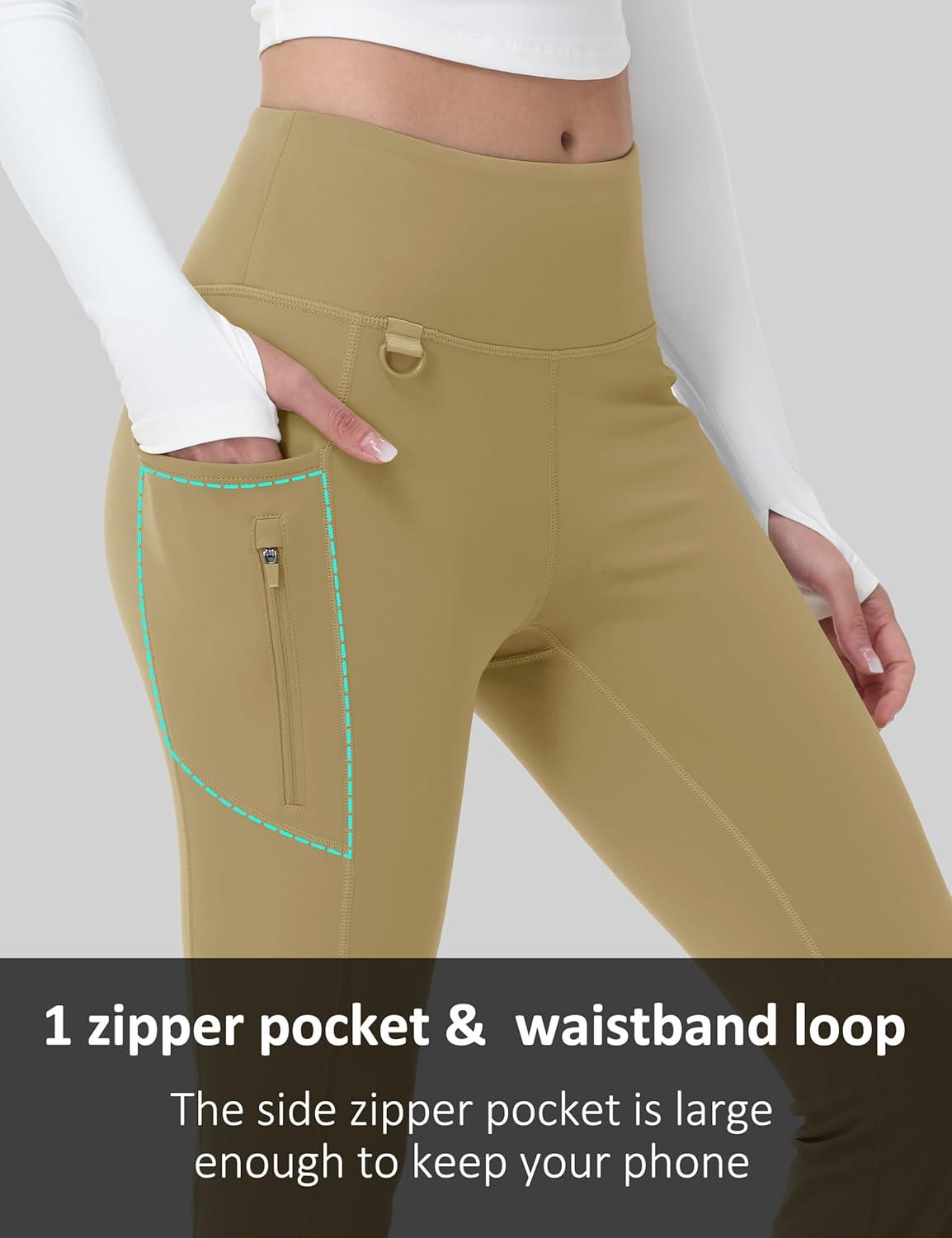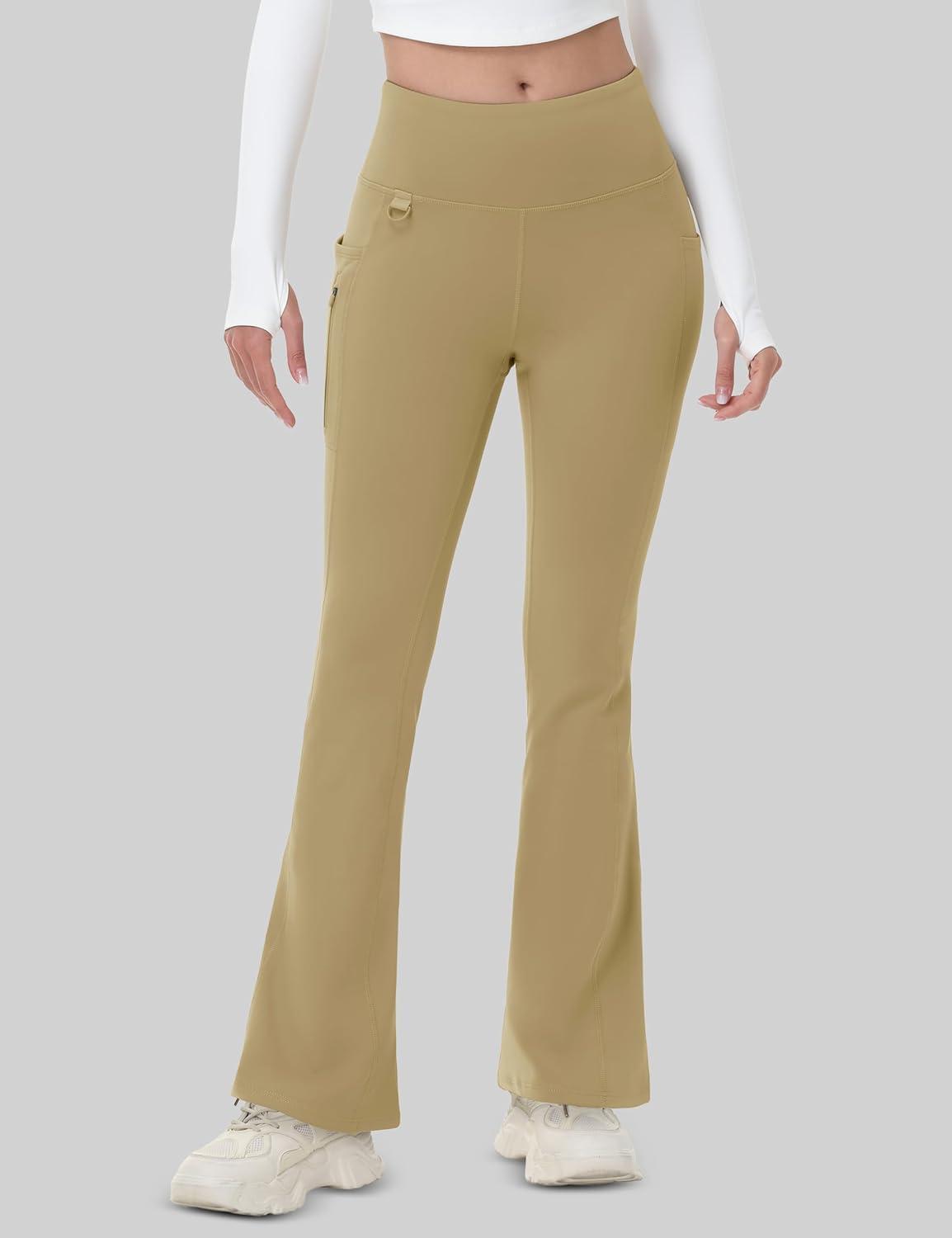 MAGCOMSEN Women’s Fleece Lined Flare Leggings Waterproof Insulated Winter Pants Warm Snow Yoga Hiking Bootcut 3 Pcokets(Khaki)