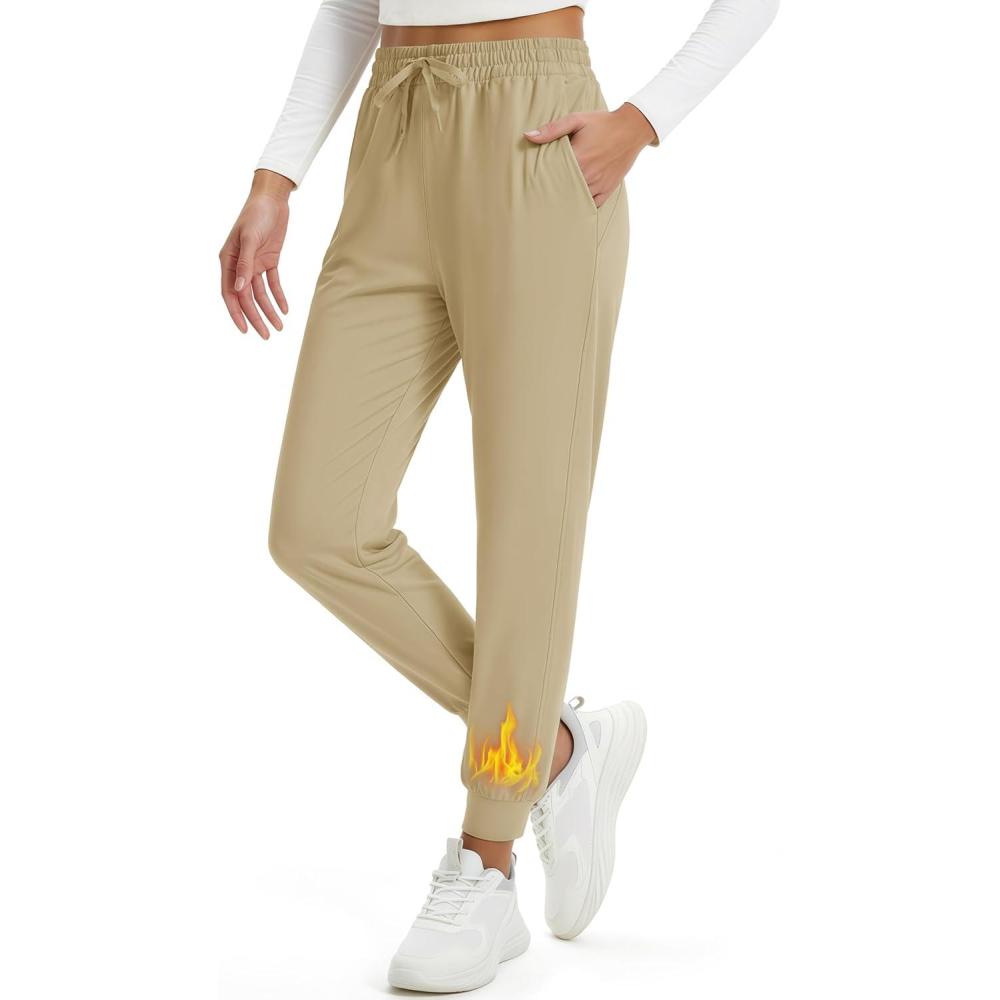 MAGCOMSEN Women’s Fleece Lined Joggers Waterproof Thermal Winter Sweatpants Insulated Hiking Running Snow Pants Pockets(Light Khaki)