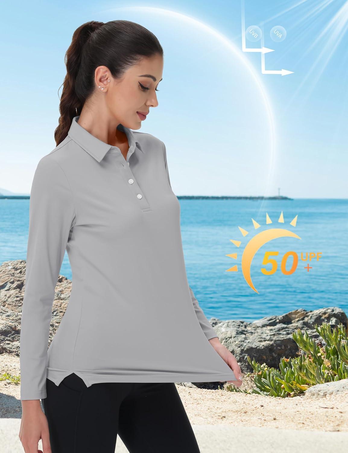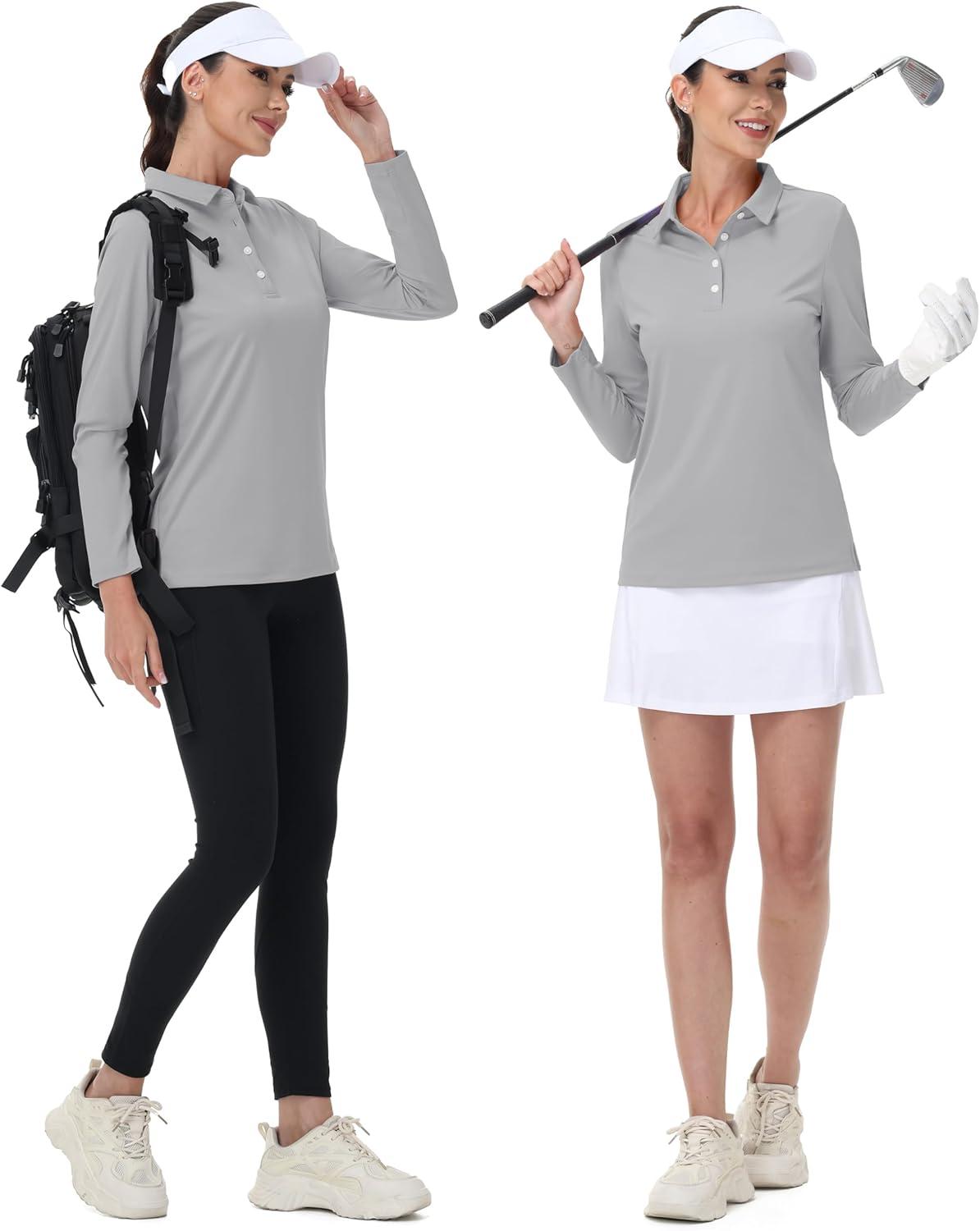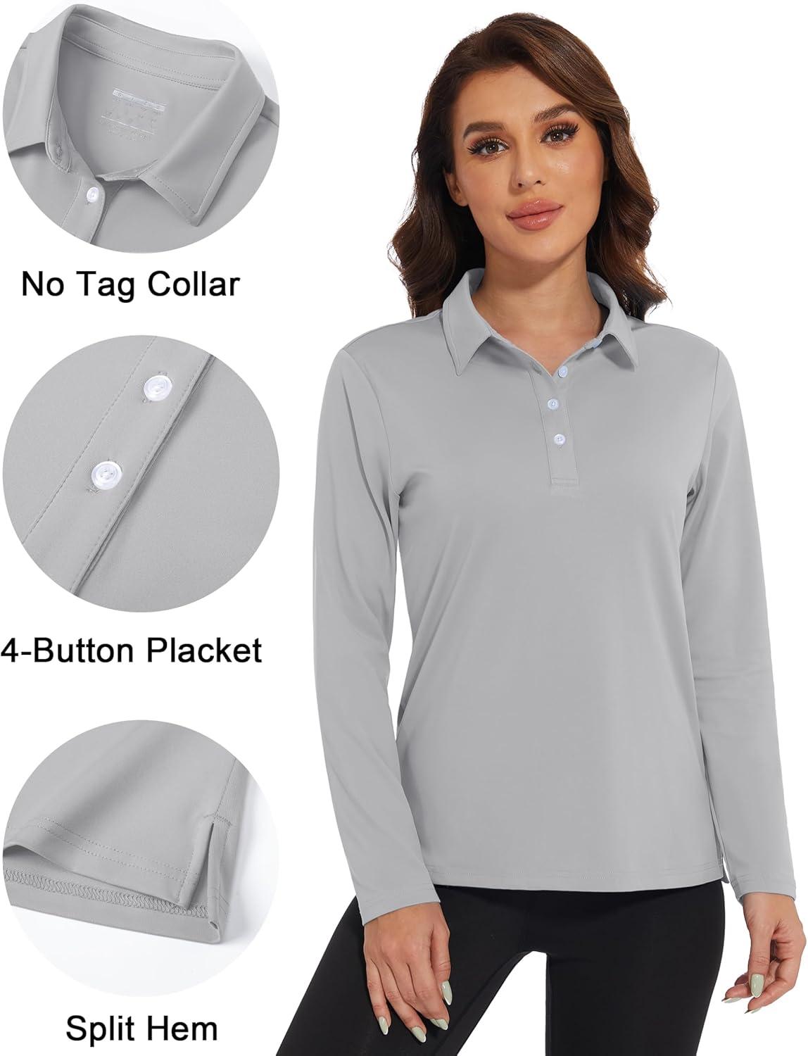 MAGCOMSEN Women’s Polo Shirts Long Sleeve Golf T Shirt Quick Dry UPF 50+ Sun Protection Lightweight Athletic Tennis Shirts(Light Grey)