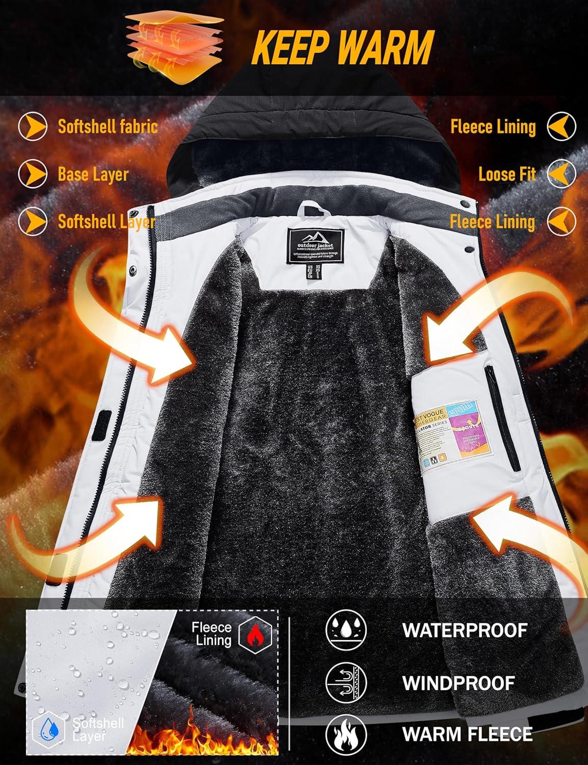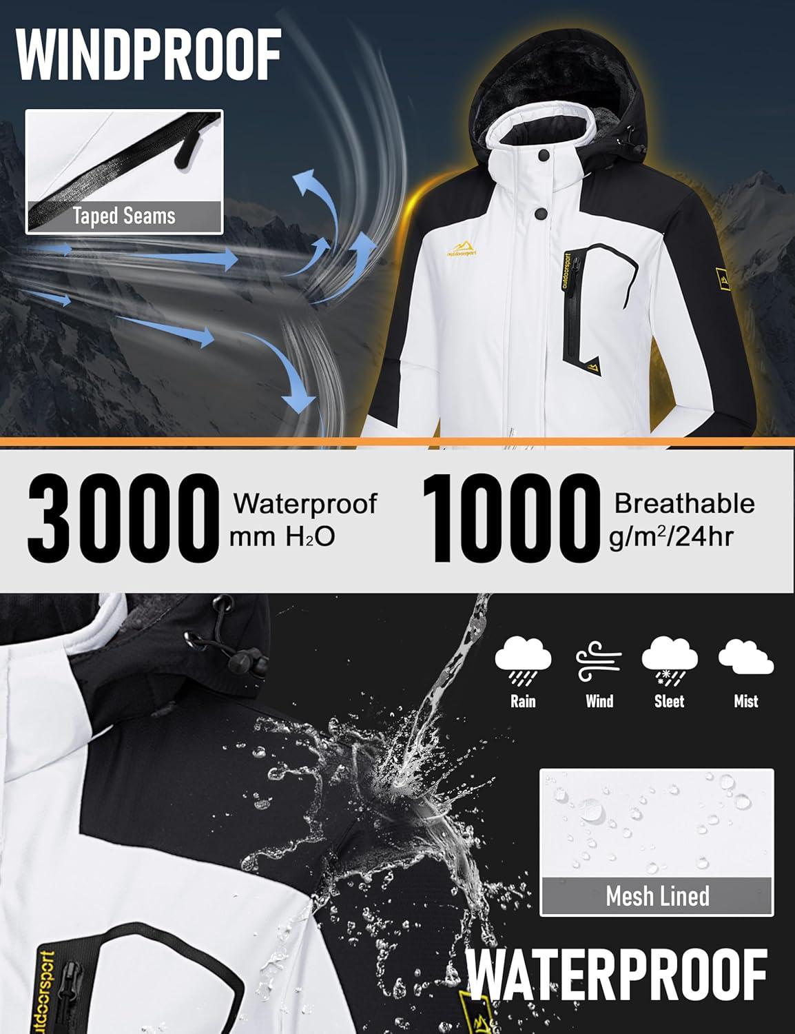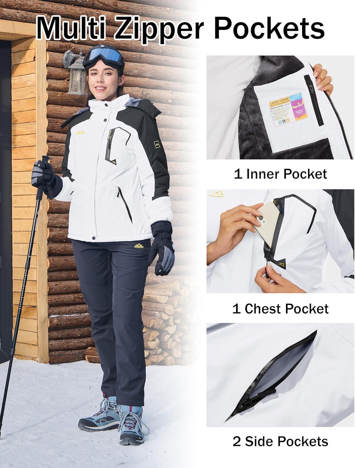 MAGCOMSEN Womens Ski Jacket Waterproof Insulated Snow Jacket Warm Windproof Winter Coats with Hood Fleece Lined Jacket(White Black)