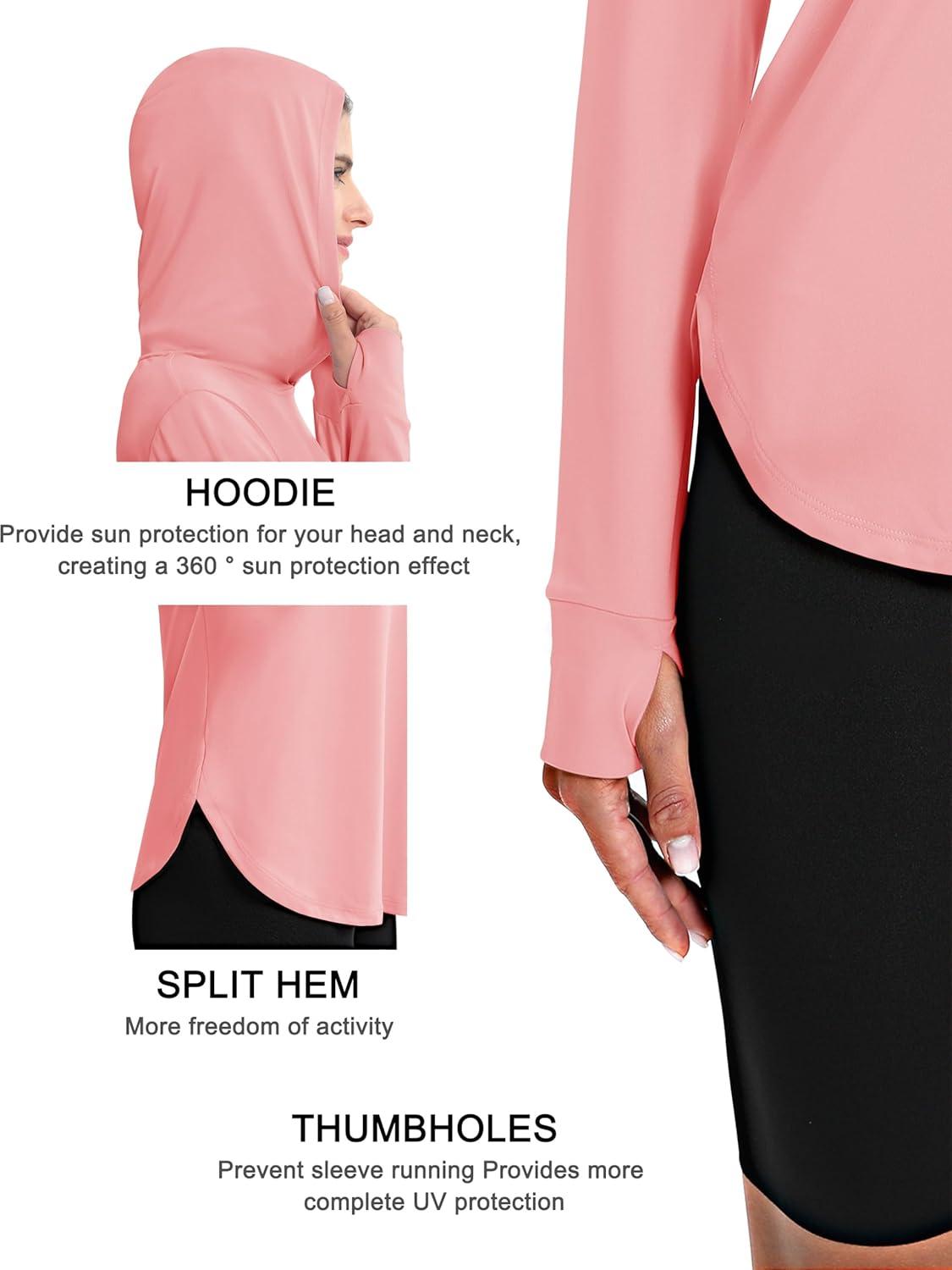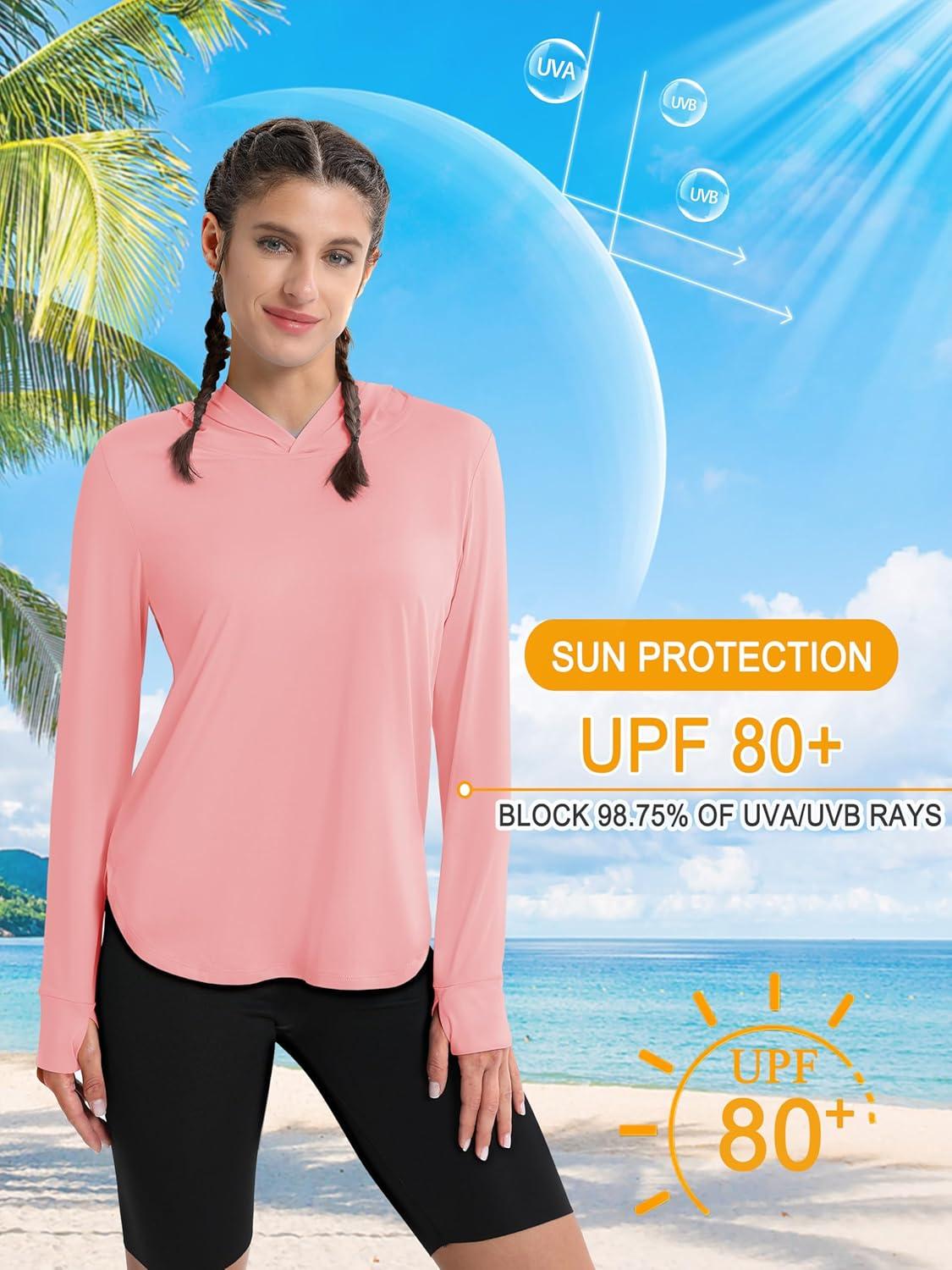 MAGCOMSEN Women’s UPF 80+ Sun Protection Hoodie Long Sleeve Hiking Fishing Lightweight UV Rashguard with Thumb Hole(Light Pink)