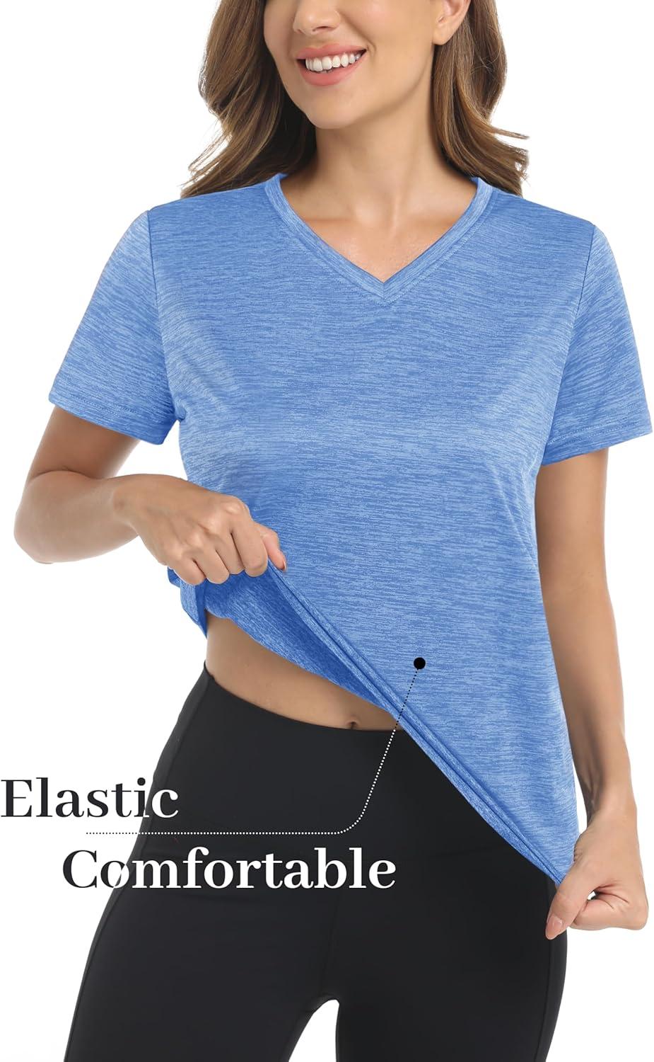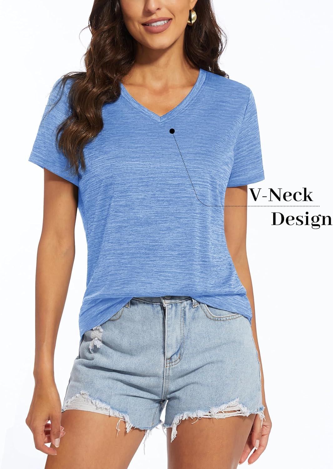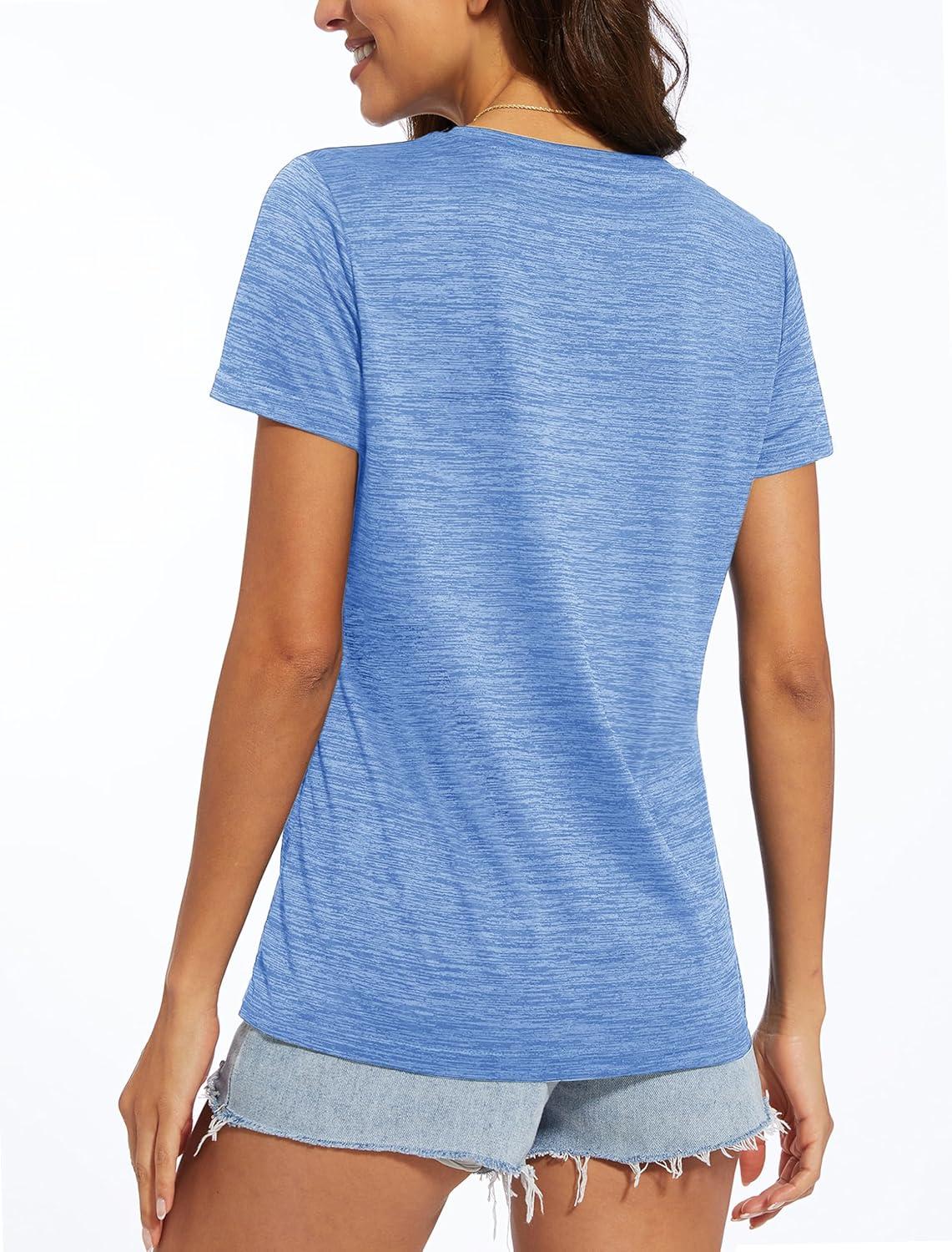 MAGCOMSEN Women’s V Neck Workout Shirts Short Sleeve Moisture Wicking Yoga T-Shirts Quick Dry Athletic Tops(Light Blue)