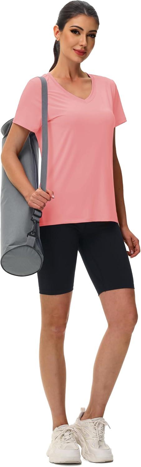MAGCOMSEN Workout Tops for Women UPF 80+ V-Neck Short Sleeve Tee Shirt Quick Dry T Shirts Gym Athletic Yoga Top(Pink)